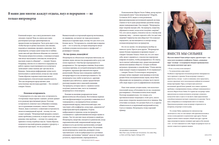 Но это не значит, что интроверты вообще не выносят суеты. Просто доза другая. "Интровертам нужно больше перерывов и времени отдыха", — говорит Сильвия Лехкен. Опять же, тот, кто знает себя, может справиться с опасностью перегрузки: вовремя отступить, чтобы дозаправиться. По опыту, часто хватает небольших пауз, среди повседневной жизни или шумных обществ. Сегодня особенно актуально стремление к спокойствию: "Очень многие люди жаждут отдыха и перерывов. И это нормально“, — говорит Лехкен. В этом вопросе интроверты, которые лучше ощущают свои границы и поэтому делают более последовательные паузы, могут быть образцами для экстравертов, которые часто тратят себя сверх меры в суете и дофаминовом опьянении.
