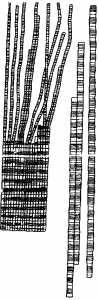 плазмы от одного конца мышцы к другому проходят тонкие сократительные нити — миофибриллы. Диаметр миофибриллы не превышает 1 µ. Волокна поперечнополосатой мускулатуры имеют длину до 12 см и диаметр 10—150 µ. В каждом волокне находится группа (до 100) миофибрилл.