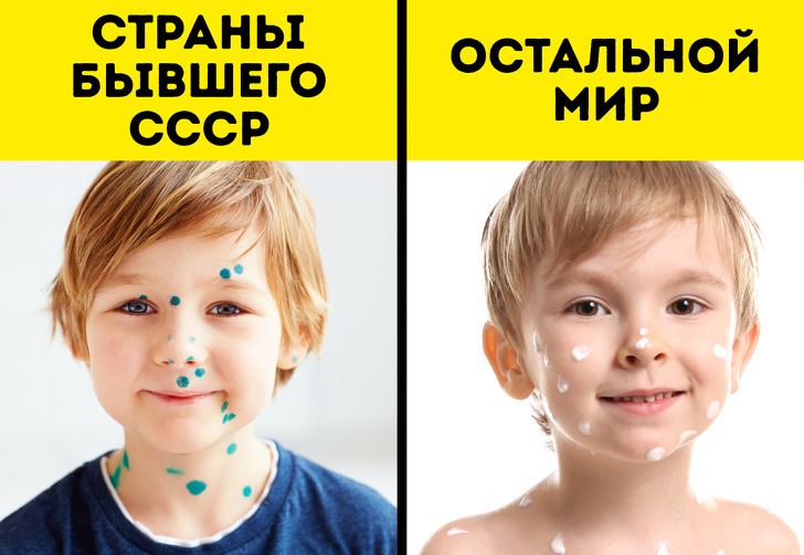 Раствор красителя бриллиантового зеленого (так называемая зеленка) в качестве антисептика применяется исключительно на постсоветском пространстве. В Европе зеленка не запрещена, но ее не используют, так как никто не проводил научных исследований на предмет ее канцерогенных свойств. Зеленку в США сейчас связывают скорее с политическими акциями, чем с антисептическими свойствами, а порезы и ссадины у детей часто смазывают бепантеном.