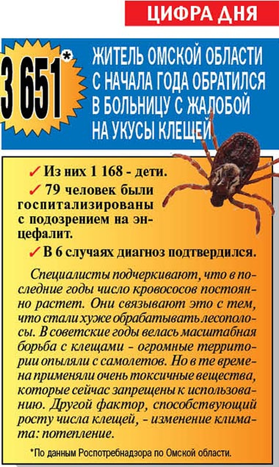 - С начала года за в больницы с жалобами на укусы клещей обратились 3 651 жителей региона, из них 1 168 детей. 79 человек были госпитализированы с подозрением на энцефалит, 18 – на клещевой боррелиоз. В 6 случаях диагноз подтвердился. Один из пострадавших – ребенок, - рассказывает главный специалист управления Роспотребнадзора по Омской области Татьяна Шереметова .