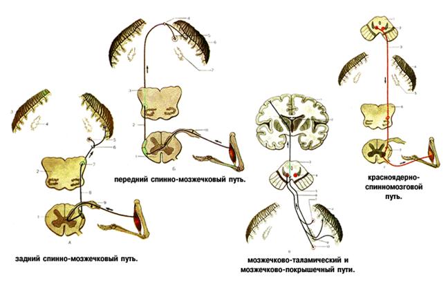 3. Спинно-мозжечковые пути - дорсальный (пучок Флексига) и вентральный (пучок Говерса) - занимают латеральные канатики. Нейроны 1-го порядка также находятся в спинальных ганглиях. Аксоны нейронов 2-го порядка, расположенные в сером веществе спинного мозга, идут по латеральным канатикам той же (путь Флексига) или противоположной (путь Говерса) стороны к мозжечку. В стволе мозга волокна пути Говерса снова перекрещиваются и поступают в кору мозжечка той же стороны. Оба пути обеспечивают передачу сигналов от проприоцепторов мышц и сухожилий, а также висцерорецепторов.