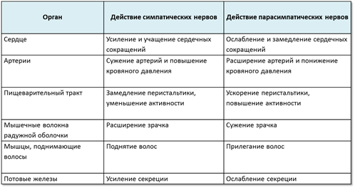 Симпатические влияния в основном активизируют работу внутренних органов, а симпатические, наоборот, замедляют. Если организм попадает в стрессовую ситуацию, для выхода из неё ресурсами некоторых органов и систем можно пренебречь и замедлить их работу. Высвободившиеся же возможности организма идут на функционирование тех систем, которые позволят за наименее короткий срок нормализовать гомеостаз. А уже в спокойной обстановке статус-кво восстанавливается.