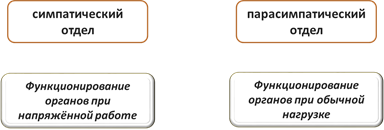 Симпатический отдел обеспечивает функционирование органов при напряжённой работе, а парасимпатический отдел – при обычной физиологической нагрузке.