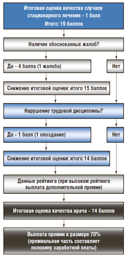 Таким образом, итоговая оценка качества составит 14 баллов из 20 возможных, или 70% (см. рисунок). Размер премиальной части, которая составляет половину общего дохода врача, при выплате заработной платы будет уменьшен на 30%.