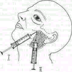 Пройдя кожу, предварительно обработанную спиртовым раствором йода и спиртом и анестезированную внутрикожным введением новокаина, прокалывают плотный апоневроз жевательной мышцы и оба ее слоя и останавливаются на глубине 3,5 см от поверхности кожи. Сюда вводят 20—30 мл 0,5% раствора новокаина. Раствор новокаина постепенно заполняет крылонебную и подвисочную ямки. После извлечения иглы следует оставить больного на 20—30 мин в таком положении, когда голова повернута в противоположную блокаде сторону и несколько опущена. В первую очередь раствор новокаина проникает в крылонебную ямку, где в верхней ее части идет верхнечелюстной нерв (перед вступлением в подглазничный канал), располагаются крылонебный узел и нижнечелюстной нерв. Концентрация новокаина составляет 0,25—0,5% и вводят его в объеме до 30 мл.