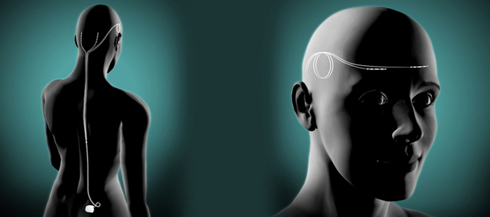 Импланты вживляются в области бровей и на затылке, подсоединяются к нервам. Генератор вшивается под кожу в области поясницы, провода прокладываются прямо под кожей, по спине.