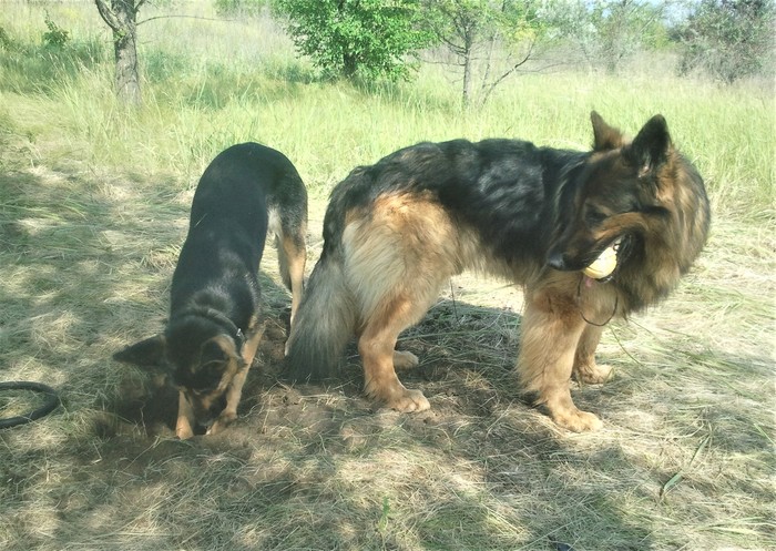 Нет справедливости и в мире животных - женщина трудится, мужчина играет в мяч. Кейси (копает ямку) и Зевс