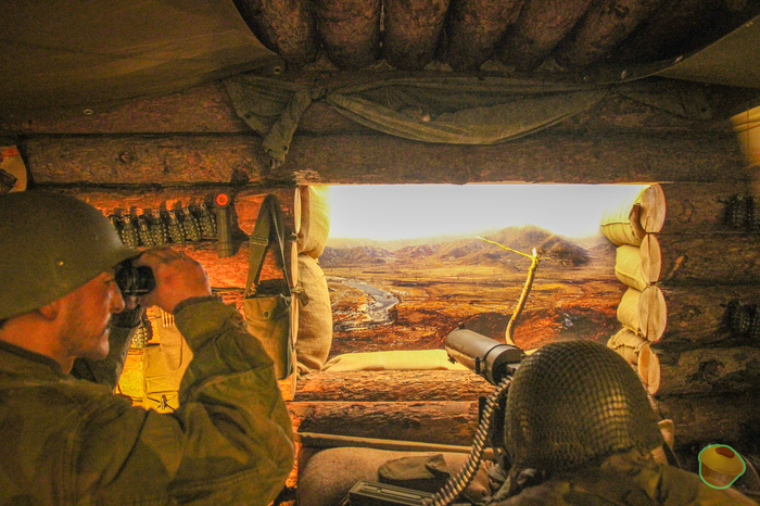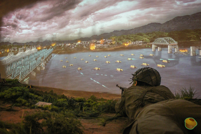 Южнокорейские солдаты стойко обороняют переправу. Перед манекенами расположен экран, чтобы придать динамичности. Горит огонь, летят пули.