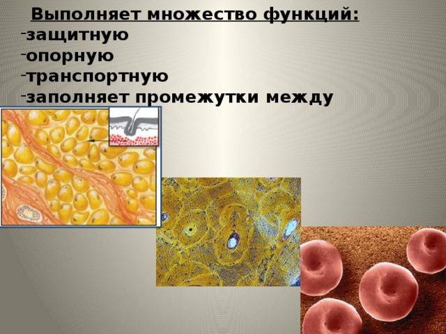 Соединительная ткань, входящая в состав скелета, поддерживает тело, создает его опору, защищает внутренние органы. В жировой соединительной ткани откладываются запасные питательные вещества в виде жира. Своеобразная соединительная ткань — кровь. Она обеспечивает внутреннюю связь между органами: от легких ко всем органам и тканям переносит кислород, а от них к легким — углекислый газ. Кровь доставляет питательные вещества от кишечника ко всем органам, а к органам выделения — вредные продукты обмена веществ.