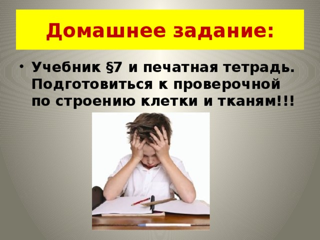 - Учебник §7 и печатная тетрадь. Подготовиться к проверочной по строению клетки и тканям.