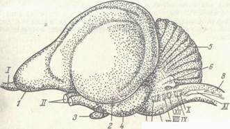 1 - обонятельная луковица; 2 - полушарие конечного мозга; 3 - гипофиз; 4 - зрительный холм (двухолмие); 5 - червь и 6 - ушко мозжечка; 7 - продолговатый мозг; 8 - спинной мозг; I—XII - черепномозговые нервы.