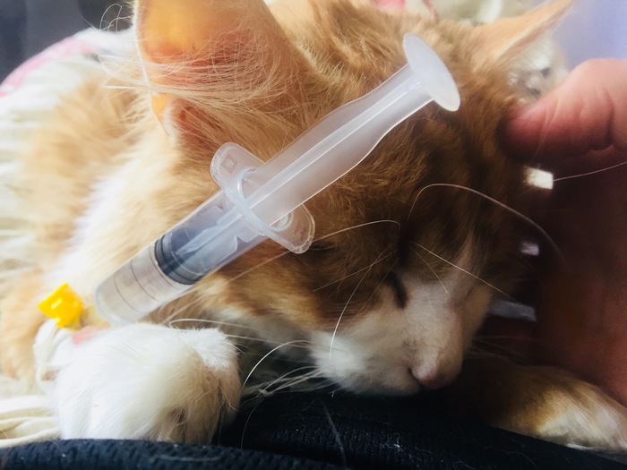 По приезду подготовила препараты и капельницу. Часть из них нужно вводить шприцом очень медленно - 7 мл полчаса, например. А 50 мл капельницы нужно вводить 2,5 часа. Пришлось сидеть с ним, держать лапу, гладить и просить поправиться.