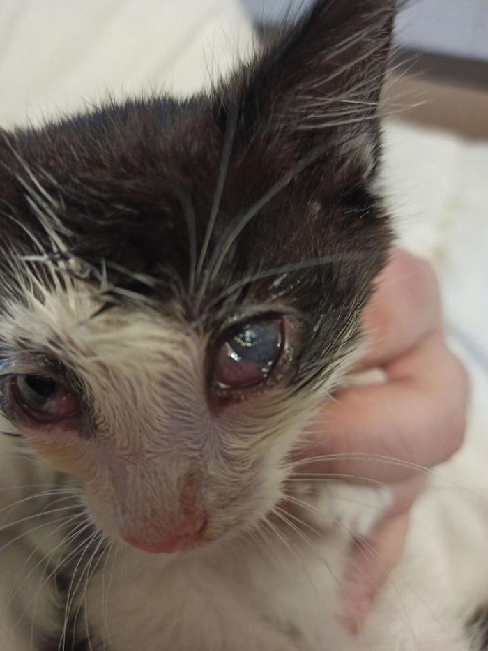 9 дней назад подобрали больного доходягу. Куча блох (обработали и вычесали), один глаз с пленкой и третьем веком, другого глаза не было совсем, под коркой гноя. Глаза отмыли и обработали. Закапали ципровет, на ночь мазали флоксалом. Дали таблетки против паразитов и курс ципровета в таблетках. Через 3 дня стал активнее и пошел на поправку. Правый глаз который был под коркой поправился.