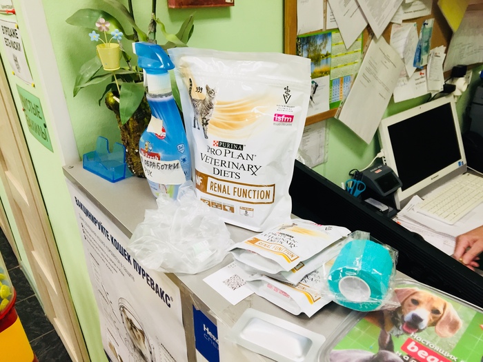 Потом поехала в клинику. Там закупалась препаратами, бинтом и кормом ренал