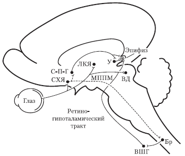 Фоторецепторы глаза выполняют двоякую роль. Они участвуют не только в зрительном восприятии, но и в регуляции циркадианных ритмов, реагируя на суточные изменения освещенности. Импульсы, в которых закодирована информация о степени освещенности, передаются по зрительным нервам (ретиногипоталамический тракт) из сетчатки в супрахиазматические ядра (СХЯ) гипоталамуса, которые играют роль центрального синхронизатора ритмов. Супрахиазматические ядра связаны с верхним шейным симпатическим ганглием и с эпифизом. Обладая пейсмекерными свойствами, СХЯ влияют на другие структуры мозга, также обладающие осцилляторными свойствами. Последние, получив информацию через гипоталаморетикулярную систему, посылают ее через симпатические нервы, берущие начало в верхнем шейном симпатическом ганглии, клеточным осцилляторам, локализованным в различных органах и тканях.