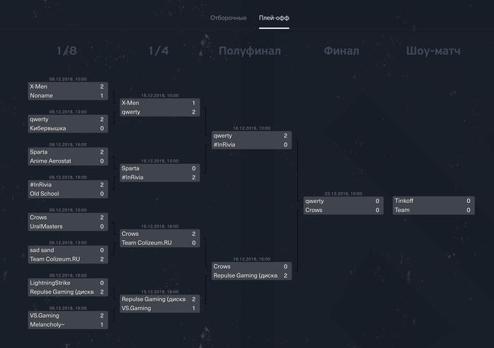 В этом турнире участвовали Repulse Gaming, которые, как потом выяснилось, использовали читы. Они дошли до финала, а затем игрок из команды VS.Gaming обратил внимание на подозрительные действия одного из игроков RG и последних дисквалифицировали. При этом, командам Lightning strike и VS.Gaming не дали возможности переиграть, хотя могли бы ввести дополнительную турнирную сетку. Tinkoff решил просто спустить все на тормозах — не учитывать только последний матч RG с Crows.