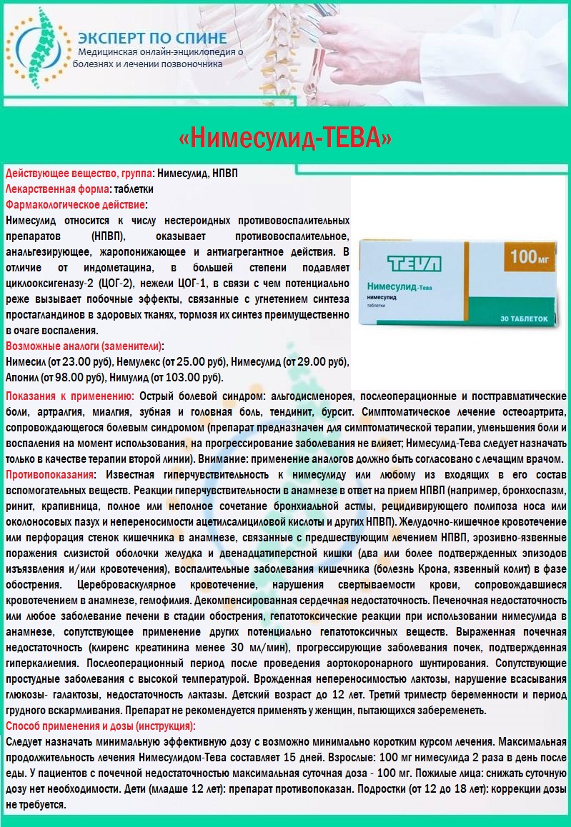 Большинство ответов на вопрос, помогает ли Нимесил при заболевании остеохондрозом, положительные – он действительно быстро облегчает состояние при боли. Нимесулид является активным веществом препаратов Апонил, Найз, Нимид и многих других.