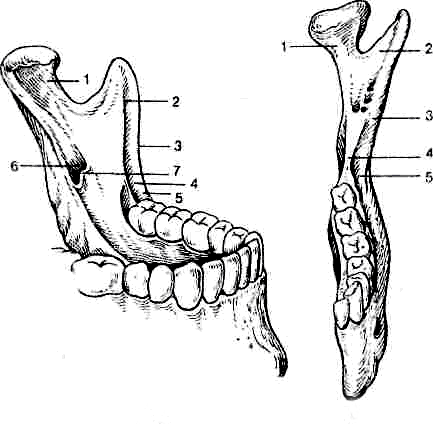 Нижнечелюстное отверстие (foramen mandibulare) расположено в средней части внутренней поверхности ветви нижней челюсти и прикрыто-спереди и снутри небольшим костным выступом — язычком нижнечелюстной кости (lingula mandibulae) (рис. 29).