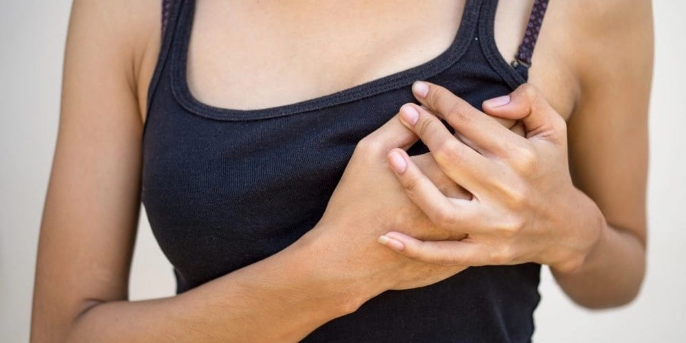 - на коже груди наблюдается участок с воспалением ткани (покраснение, отечность);