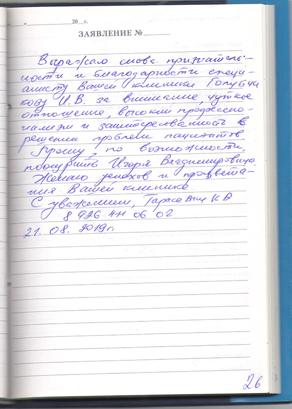 Выражаю слова признательности и благодарности специалисту Вашей клиники Голубчикову И.В. за внимание, чуткое отношение, высокий профессионализм и заинтересованность в решении проблем пациентов. Прошу, по возможности, поощрить Игоря Владимирович. Желаю успехов и процветания Вашей клинике. С уважением, Тарасевич К.В.