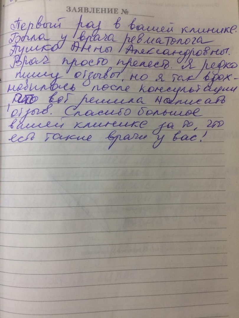 Первый раз в вашей клинике. Была у врача ревматолога Пушко Анны Викторовны. Врач просто прелесть. Я редко пишу отзывы, но я так вдохновилась после консультации, что вот решила написать отзыв. Спасибо большое вашей клинике за то, что есть такие врачи у вас!