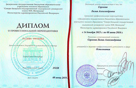 2008 г. – профессиональная переподготовка по рефлексотерапии на базе Государственного медико-стоматологического университета г. Москвы.
