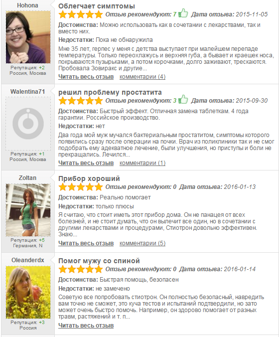 Очень много уже положительных отзывов о приборе " Стиотрон ", но конечно же нужно проконсультироваться с врачом, сдать анализы. " Стиотрон " может помочь от многих заболеваний, так же это очень удобно, не нужно бегать по поликлиникам, а делаете процедуру дома, в удобное для вас время.