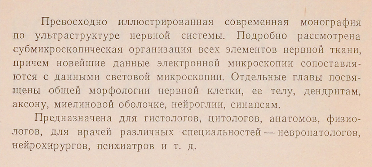 Превосходно иллюстрированная монография по ультраструктуре нервной системы. Подробно рассмотрена субмикроскопическая организация всех элементов нервной ткани. При этом данные электронной микроскопии сопоставляются с данными световой микроскопии. Отдельные главы посвящены общей морфологии нервной клетки, ее телу, дендритам, аксону, миелиновой оболочке, нейроглии, синапсам и проч. Великолепно выполненные и подробно описанные электронные микрофотографии (61 полностраничный снимок) превращают монографию в своеобразный атлас по ультраструктуре нервной ткани, который может быть настольной книгой для всех, кто занимается изучением нервной системы. Предназначена для морфологов (гистологов, цитологов, электронномикроскопистов), биологов, нейрофизиологов, невропатологов, нейрохирургов, психиатров, специалистов, занимающихся проблемами экспериментальной патологии, а также преподавателей и аспирантов соответствующих кафедр медицинских вузов и биологических факультетов университетов.