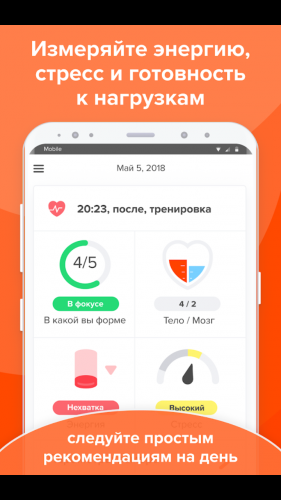 Приложение при помощи камеры определяет ваш сердечный ритм. Основываясь на полученных результатах, программа будет вам рекомендовать, что делать дальше (идти на тренировку или отдохнуть, как расслабиться вечером и т.д.).