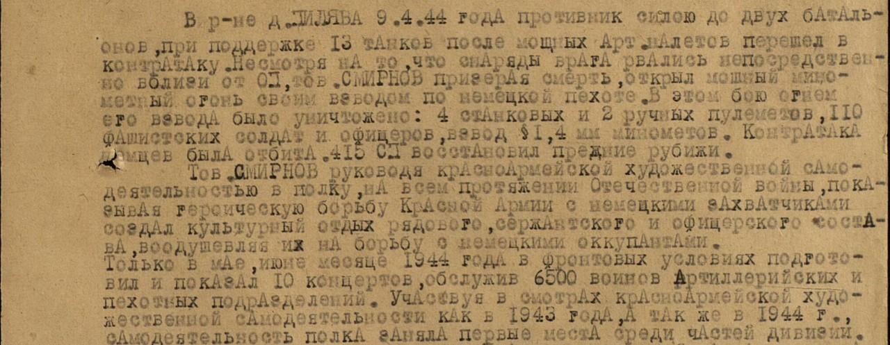 20 июля 1944 года в районе высоты 283.0 противник бросил в атаку до 40 бойцов. Смирнов бросился в бой с личным оружием, воодушевляя товарищей, тем самым отбив атаку. В том бою немцы потеряли 17 солдат, а Смирнов лично взял в плен семь человек. Через неделю, в районе деревни Журавка, выбирая новые огневые позиции, Смирнов и трое его однополчан столкнулись с группой противника из 16 человек. Немцы попытались взять советских солдат в плен, но те дали отпор, уничтожив 9 и взяв в плен пятерых. За личное мужество в этих боях Смирнов был удостоен ордена Славы III степени.