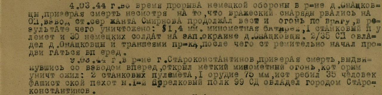 Во время прорыва немецкой обороны в районе деревни Онацковцы 4 марта 1944 года Смирнов со своим взводом уничтожил миномётную батарею, станковый пулемёт и до 30 солдат противника. Отбив Онацковцы, взвод продвинулся вперёд и 9 марта овладел городом Староконстантинов. В том бою старший сержант Смирнов со взводом уничтожили 2 станковых пулемёта, 75-мм орудие и 35 пехотинцев противника. За мужество, проявленное в этих боях, Смирнов был представлен к ордену Отечественной войны I степени, но был награждён менее значимым орденом Красной Звезды.
