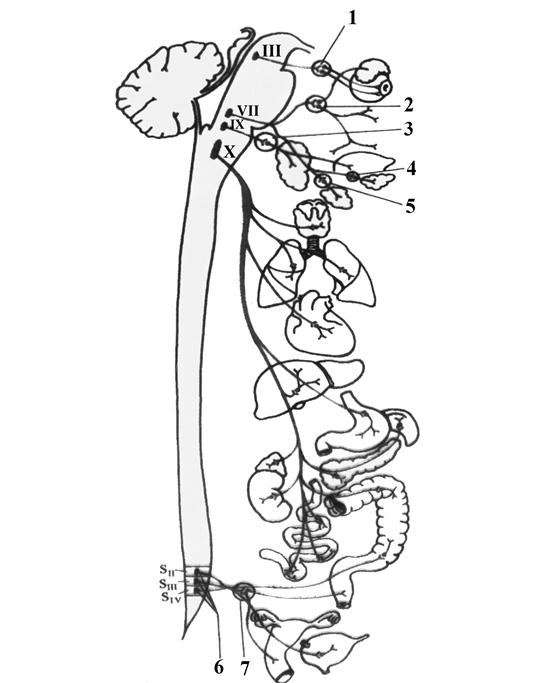 III – n. oculomotorius; VII – n. facialis; IX – n. glossopharyngeus; X – n. vagus; 1 – ganglion ciliare; 2 – ganglion pterygopalatinum; 3 – ganglion oticum; 4 – ganglion submandibulare; 5 – ganglion sublinguale; 6 – nuclei parasympathici sacrales; 7 – ganglia pelvica.