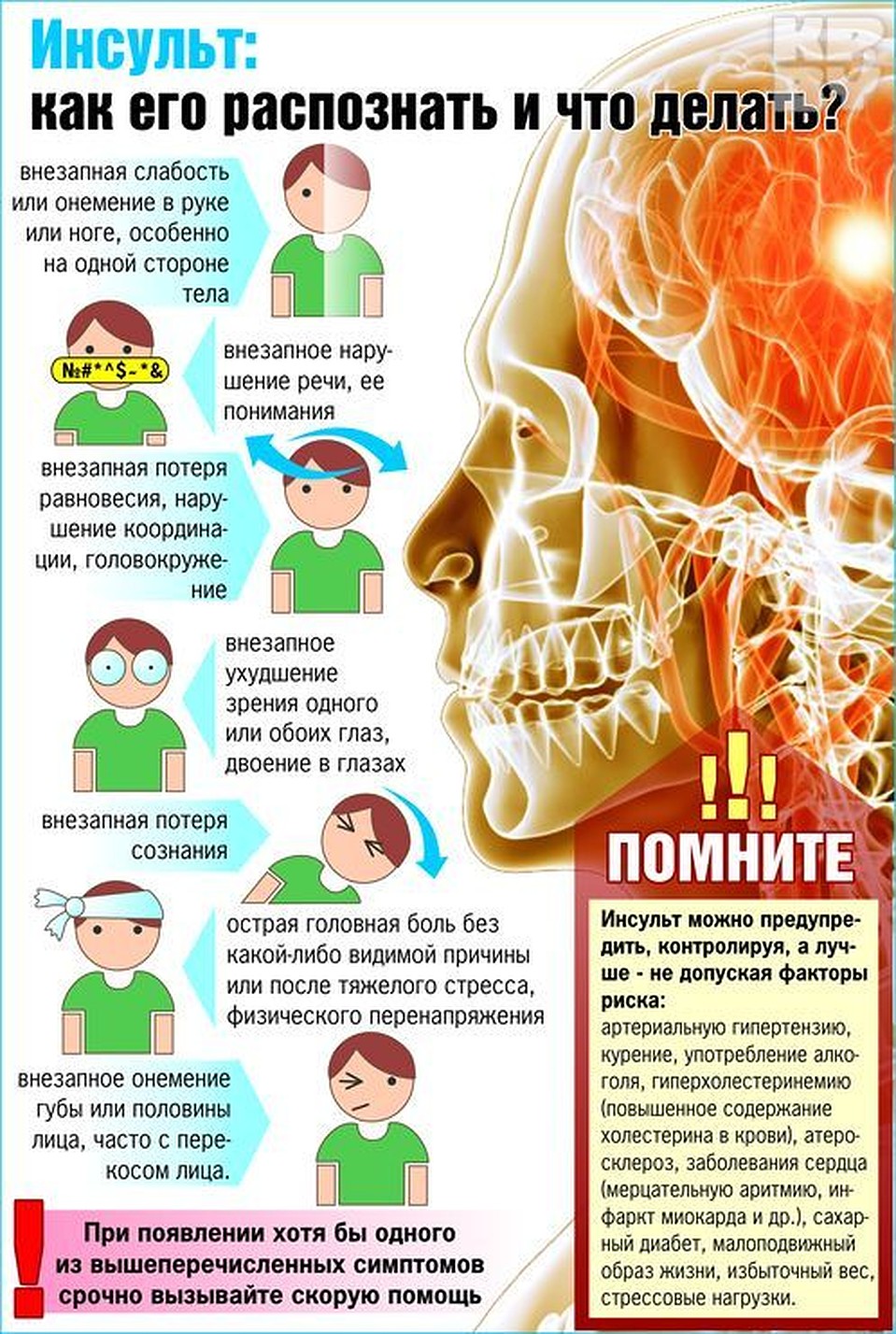 Помните, инсульт можно предупредить, контролируя, а лучше - не допуская факторы риска: артериальную гипертензию, курение, употребление алкоголя, гиперхолестеринемию (повышенное содержание холестерина в крови), атеросклероз, заболевания сердца (мерцательную аритмию, инфаркт миокарда и др .), сахарный диабет, малоподвижный образ жизни, избыточный вес, стрессовые нагрузки.