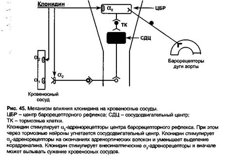 В более высоких дозах клонидин стимулирует внесинаптические а2B-адренорецепторы гладких мышц кровеносных сосудов (рис. 45) и при быстром внутривенном введении может вызывать кратковременное сужение сосудов и повышение артериального давления (поэтому внутривенно клонидин вводят медленно, в течение 5-7 мин).