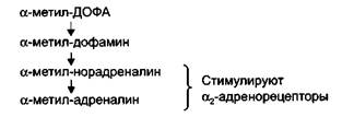 Метилдопа(допегит, альдомет) по химической структуре — а-метил-ДОФА. Препарат назначают внутрь. В организме метилдопа превращается в метилнорадреналин, а затем в метиладрена-лин, которые стимулируют а2-адренорецепторы центра барорецеп-торного рефлекса.