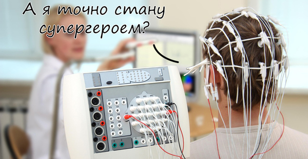 И последний этап - психофизиологические методики. Надеваем на дядю Гришу шапочку с электродами. У нас как раз оказался электроэнцефалограф. Он позволяет регистрировать биоэлектрическую активность мозга. Мы можем фиксировать состояние мозга и его изменение при действии различных раздражителей. Можно измерить такие показатели, как скорость реакции, темп, выносливость и т.п.