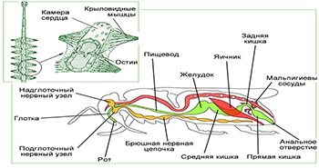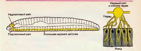 Здесь на изображении видим надглоточный и подглоточный узлы, брюшную нервную систему. На срезе видно, что волокна "нервов" тянутся к коже и это показано в одном из "члеников" животного: