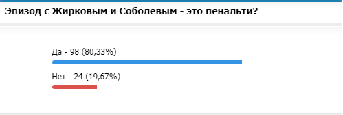 После перерыва даже Георгий Черданцев с Романом Широковым признали, что эпизод стоило минимум посмотреть главному арбитру. На момент остановки первоначального опроса 4/5 части читателей высказались за пенальти в ворота "Зенита".