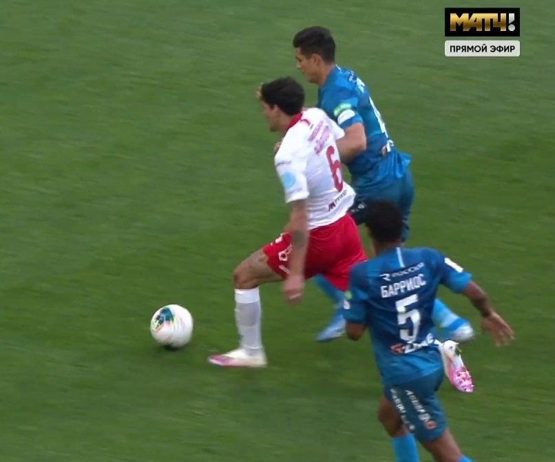 Момент сложнее - Барриос немного попал рукой по лицу Александру, но стало ли это причиной падения, пенальти ли это - вопрос куда менее очевидный, чем в эпизоде с Жирковым. Возможно, у Соболева после резкой смены движения просто поехали ноги.