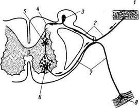 | Рис. 264. Схема рефлекторной дуги. 1 — нервное окончание чувствительного нейрона в коже; 2 — периферический отросток чувствительного нейрона; 3 — спинномозговой узел; 4 — центральный отросток чувствительного нейрона; 5 — вставочный нейрон; 6 — двигательная клетка переднего рога; 7 — нейрит двигательной клетки; 8 — нервное окончание в мышце. |