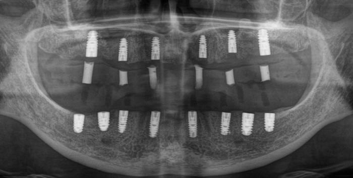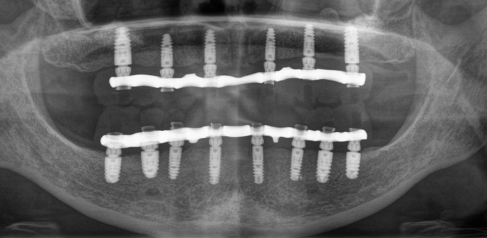 На верхней челюсти были установлены шесть имплантатов и проведена операция по наращиванию костной ткани – синус-лифтинг (с обеих сторон). Через 2 недели установлены 8 имплантатов на нижней челюсти.