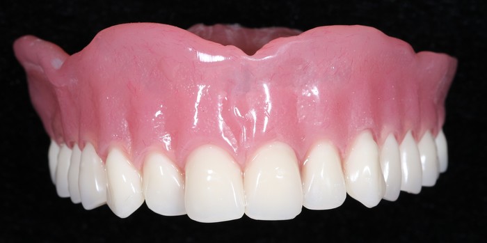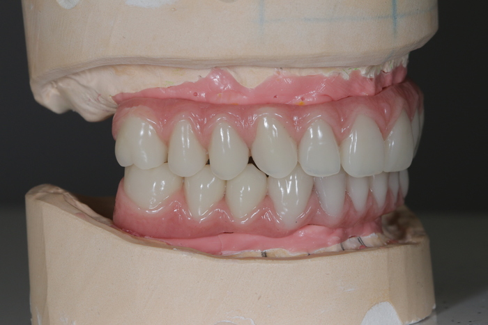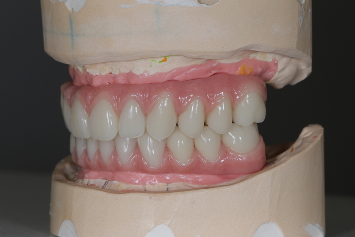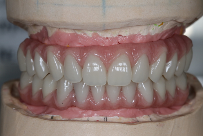 Далее ортопедом были сняты слепки, а техник в лаборатории изготовил вот такой постоянный протез с опорой на имплантатах.