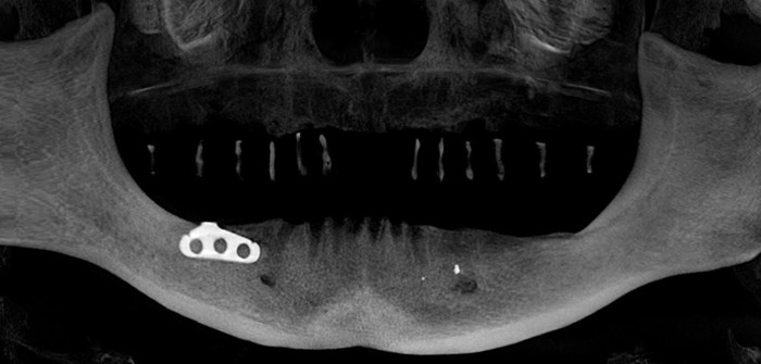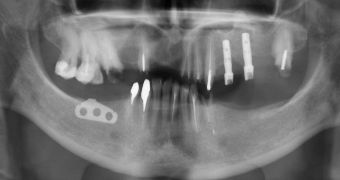 Вот на кой хер при такой ширине альвеолярной части установили средневековый пластиночный имплантат, остается для меня загадкой.