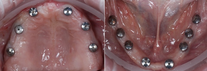 Спустя четыре месяца были установлены формирователи десны на верхней (снимок слева) и нижней (снимок справа) челюстях.
