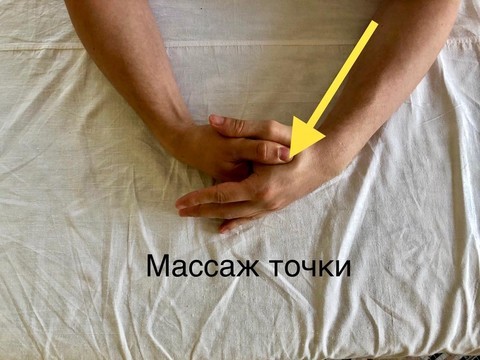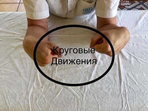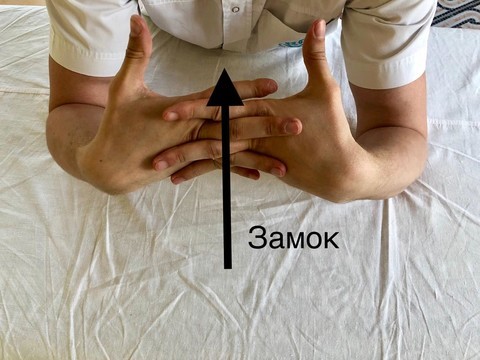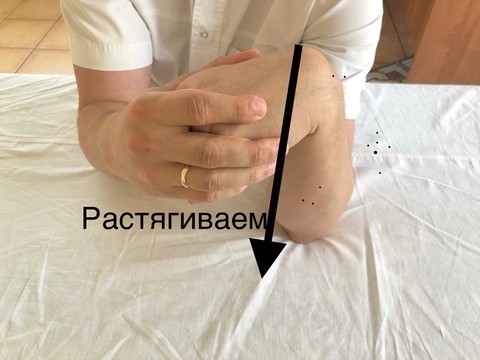 - Поворачиваем руку ладонью вниз, указательный палец второй руки ставим по оси кисти и надавливаем ладонью помогающей руки на кисть, пальцы руки смотрят вниз.