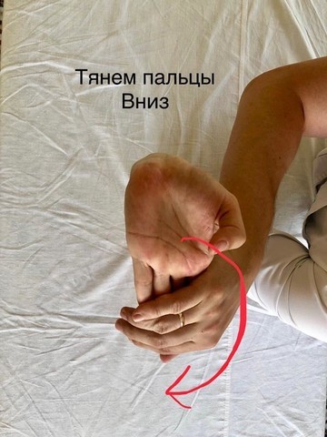 - Вытягиваем одну руку вперед ладонью вверх и натягиваем пальцы на себя, вниз (с помощью другой руки).