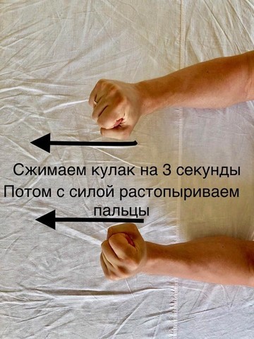 - Сжимаем кисть в кулак, держим 3 секунды, потом с силой растопыриваем пальцы. Делаем 15–20 раз.