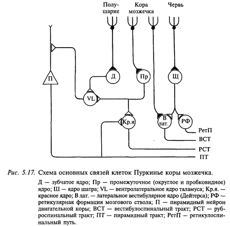 Единственным эфферентным выходом из коры мозжечка являются аксоны клеток Пуркинье, образующие синапсы с нейронами внутримозжечковых ядер и нейронами латерального вестибулярного ядра (рис. 5.17). Тесная связь ядра Дейтерса с корой мозжечка дает основание рассматривать его функционально как внутримозжечковое ядро. Все остальные образования головного и спинного мозга не получают прямых эфферентов из коры мозжечка. Ядра шатра посылают волокна к ядрам Дейтерса и к ретикулярной формации продолговатого мозга. Из области ретикулярной формации, где оканчиваются пути от мозжечка, берет начало ретикулоспинальный путь. Промежуточные ядра посылают аксоны в средний мозг, в том числе к красному ядру. Мощные пучки волокон, образованные преимущественно аксонами нейронов зубчатого ядра, направляются к вентролатеральному ядру таламуса, где происходит синаптическое переключение, и аксоны постсинаптических нейронов идут в моторную область коры больших полушарий; часть аксонов направляется к базальным ядрам. Таким образом, мозжечок не имеет самостоятельных двигательных систем, но образует обширные связи со всеми моторными системами: кортикоспинальной (пирамидной), руброспинальной, ретику-лоспинальной, вестибулоспинальной, а также с полосатым телом.