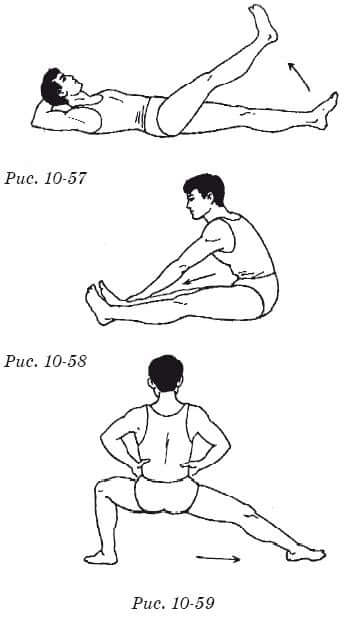Стоять. Встаньте прямо, руки на поясе. Сперва по очереди поднимайте ноги вперёд перед собой, колени держите прямыми. Затем сделайте максимальный шаг стопой в сторону, и попеременно сгибайте ноги в коленях. Приседайте на корточки то в одну, то в другую сторону словно натягиваете лук, чтобы выпрямленная нога растягивалась и выпрямлялась под силой тяги.