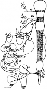 Другая часть клетки продолговатого мозга дает начало блуждающему нерву, который сильно разветвляется; образовавшиеся многочисленные веточки иннервируют сердце, пищевод, бронхи, желудок, тонкие кишки, верхние отделы толстых кишок, поджелудочную железу, надпочечники, почки, печень, селезенку.